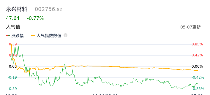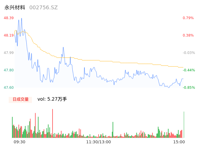 05月07日,永兴材料收报47.64,股价涨幅-0.77%,成交金额2.52亿元,换手率1.36%。