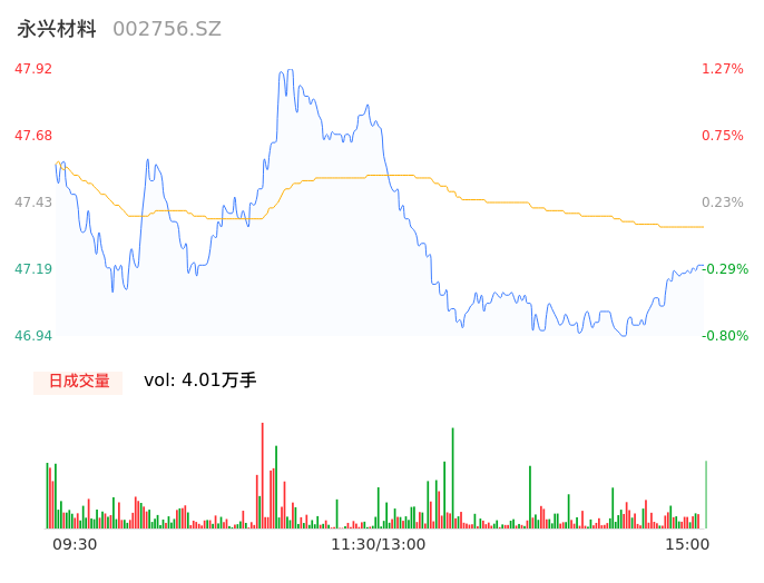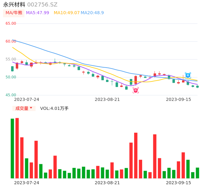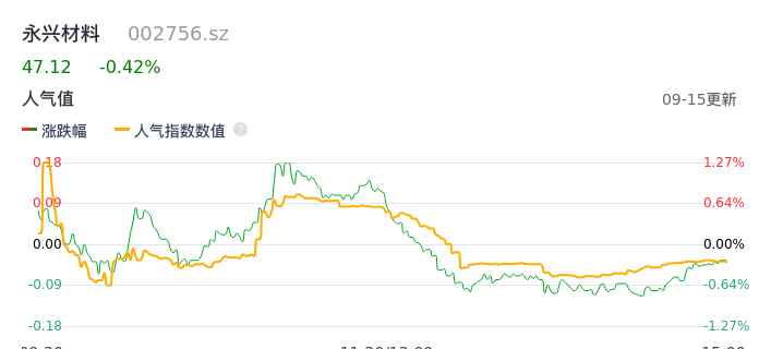 09月15日,永兴材料收报47.12,股价涨幅-0.42%,成交金额1.90亿元,换手率1.04%。