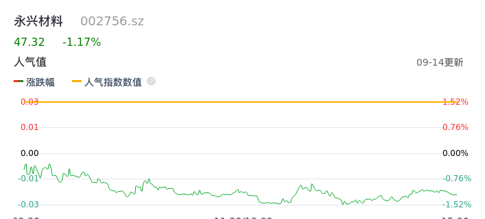 09月14日,永兴材料收报47.32,股价涨幅-1.17%,成交金额1.50亿元,换手率0.82%。