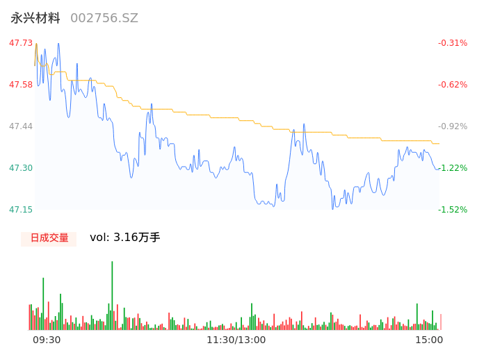 09月14日,永兴材料收报47.32,股价涨幅-1.17%,成交金额1.50亿元,换手率0.82%。