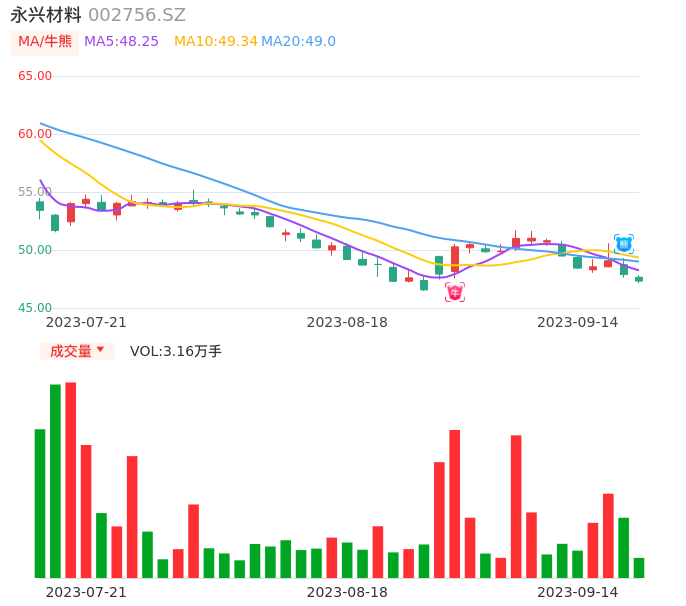 值得注意的是:2023年09月民生证券的邱祖学/张建业/南雪源分析师,首次发布关于永兴材料的研究报告,标题为:永兴材料(002756)2023年半年报点评:锂盐业务以量补价 特钢业务表现亮眼。