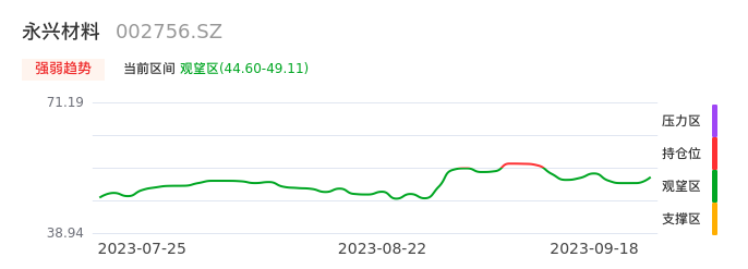 我们来看一下该股的九方特色指标强弱趋势的情况:永兴材料自09月07日从持仓区下穿到观望区。股价近期持续下跌后,短期出现止跌迹象。后续重点关注能否再次站上多空分界点:49.11元。如未能有效突破则可能进入新一轮空头行情。