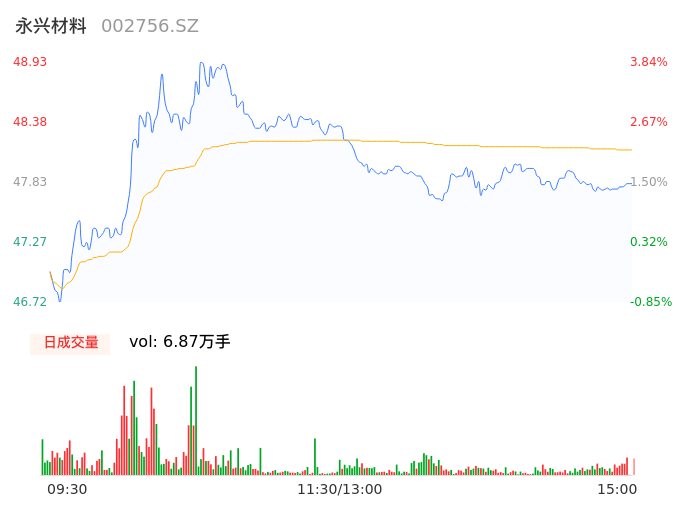 09月18日,永兴材料收报47.82,股价涨幅1.49%,成交金额3.31亿元,换手率1.78%。