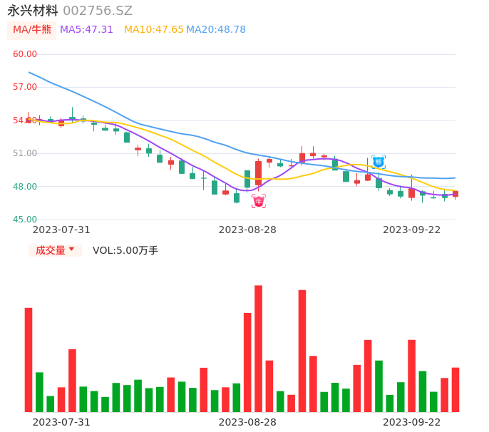 永兴材料在9月13日出现日线级别熊点,且60分钟级别也处于熊点区间,股价处于偏弱行情,注意下方箱型支撑位:46.47元,如果被有效跌穿将进入快速下降通道。