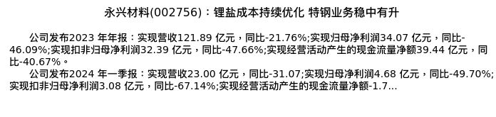 值得注意的是:2024年05月国信证券的刘孟峦/杨耀洪分析师,首次发布关于永兴材料的研究报告,标题为:永兴材料(002756):锂盐成本持续优化 特钢业务稳中有升。