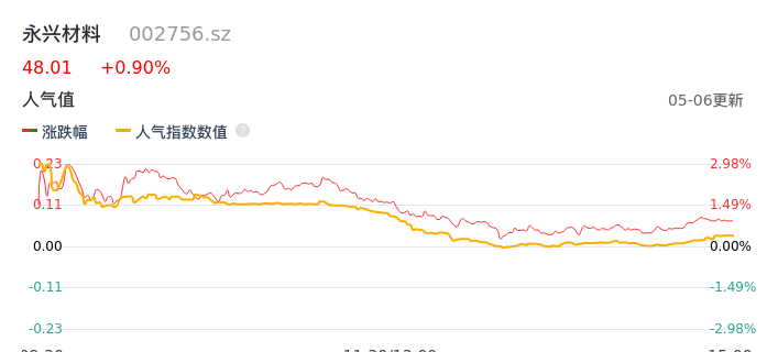 05月06日,永兴材料收报48.01,股价涨幅0.90%,成交金额3.76亿元,换手率2.01%。