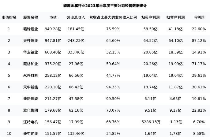 永兴材料最新报告期数据为半年度,下表汇总了能源金属行业内市值靠前的公司半年度主要经营数据