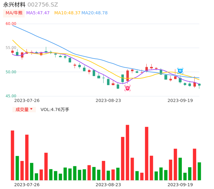 09月19日,永兴材料收报47.20,股价涨幅-1.30%,成交金额2.24亿元,换手率1.23%。