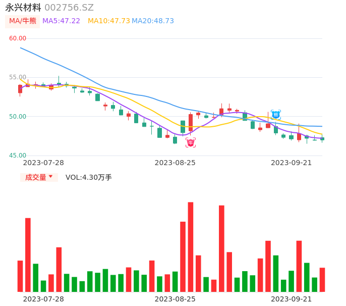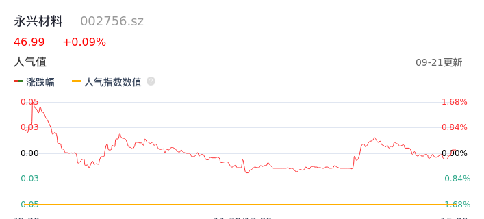 09月21日,永兴材料收报46.99,股价涨幅0.09%,成交金额2.02亿元,换手率1.11%。