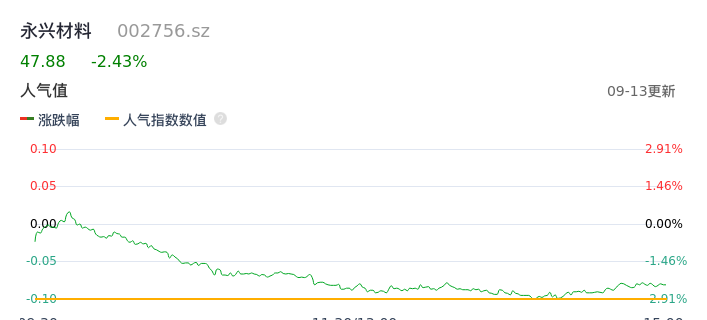 09月13日,永兴材料收报47.88,股价涨幅-2.43%,成交金额2.64亿元,换手率1.42%。