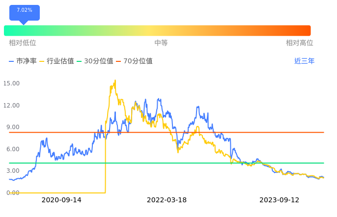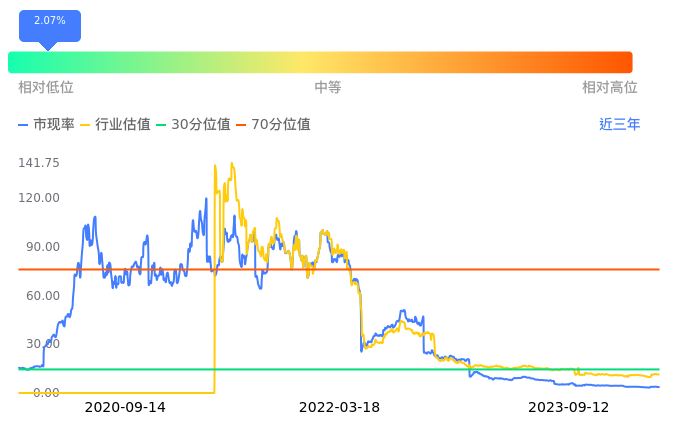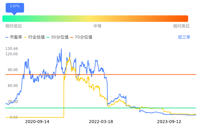 2023年09月12日,永兴材料上涨1.07%收于49.07,今日成交金额3.40亿元。下文将从市盈率PETTM、市净率PB、市现率3个角度去分析公司估值情况。