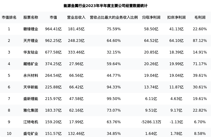 永兴材料最新报告期数据为半年度,下表汇总了能源金属行业内市值靠前的公司半年度主要经营数据