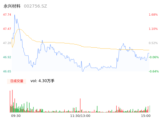 09月21日,永兴材料收报46.99,股价涨幅0.09%,成交金额2.02亿元,换手率1.11%。