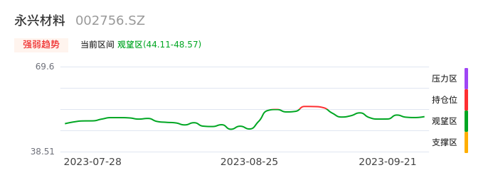 我们来看一下该股的九方特色指标强弱趋势的情况:永兴材料自09月07日从持仓区下穿到观望区。股价近期持续下跌后,短期出现止跌迹象。后续重点关注能否再次站上多空分界点:48.57元。如未能有效突破则可能进入新一轮空头行情。