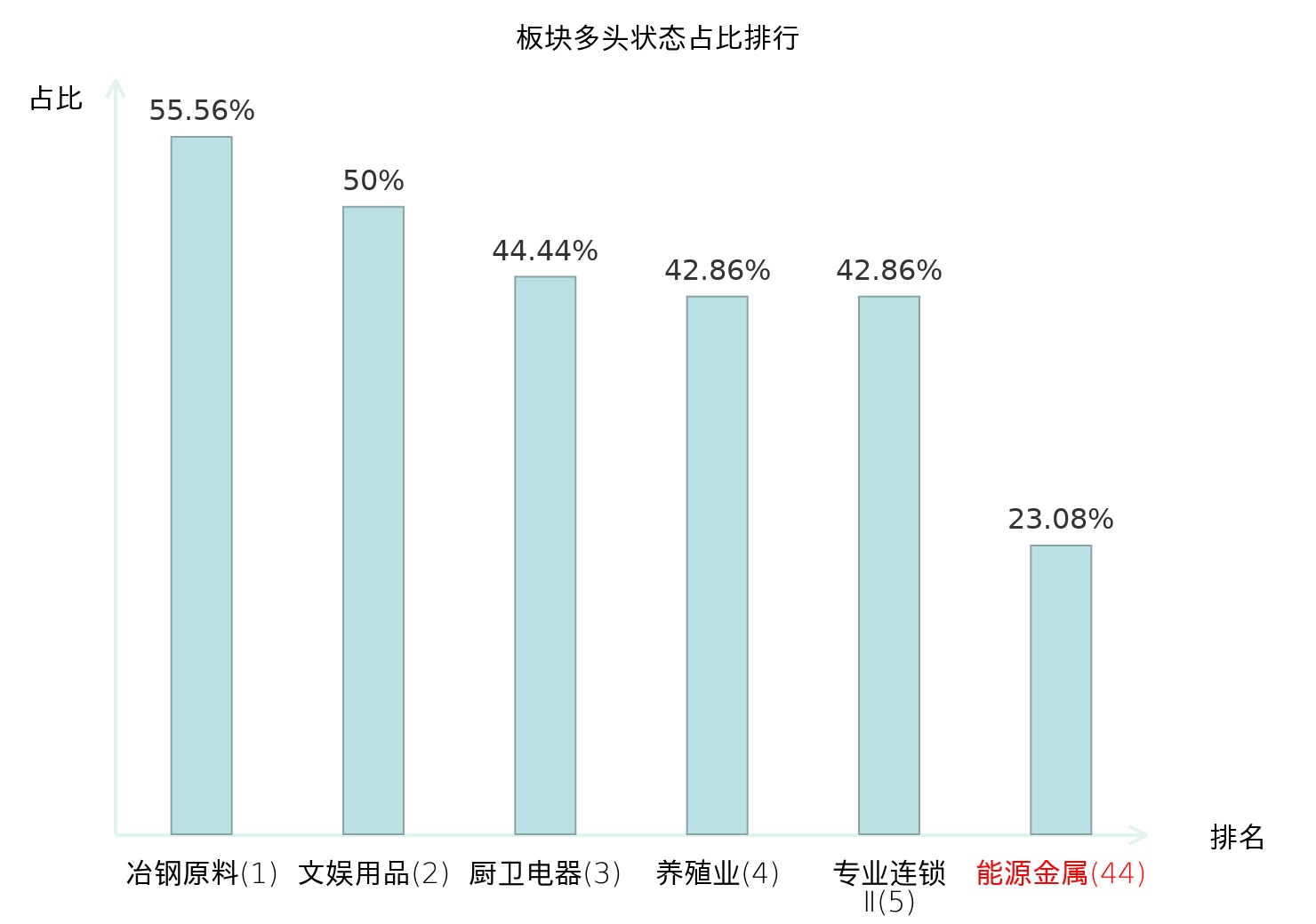 全市场所有行业板块中主力多头状态占比排名中,冶钢原料板块位居第一。能源金属板块名次提升最快,较昨日上升48位。