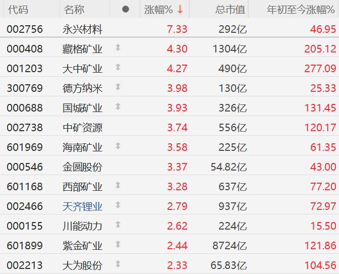 A股市场锂矿股走强,其中,永兴材料涨超7%,藏格矿业、大中矿业涨超4%,德方纳米、国城矿业、中矿资源、海南矿业、金圆股份、西部矿业涨超3%,天齐锂业、川能动力、紫金矿业、大为股份涨超2%。值得注意的是,藏格矿业、中矿资源创历史新高。消息面上,碳酸锂主力合约盘中强势突破13万关口,日内涨超8%,创2023年11月以来新高。