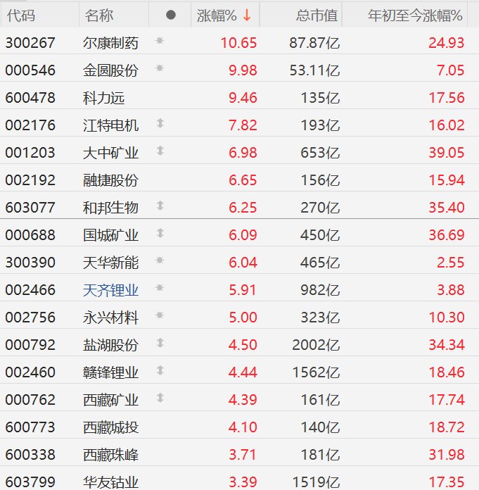 格隆汇2月26日|A股市场锂矿概念股集体高开,其中,金圆股份涨停,科力远逼近涨停,江特电机涨超7%,大中矿业、融捷股份、和邦生物、国城矿业、天华新能涨超6%,天齐锂业、永兴材料涨超5%,盐湖股份、赣锋锂业、西藏矿业、西藏城投涨超4%。