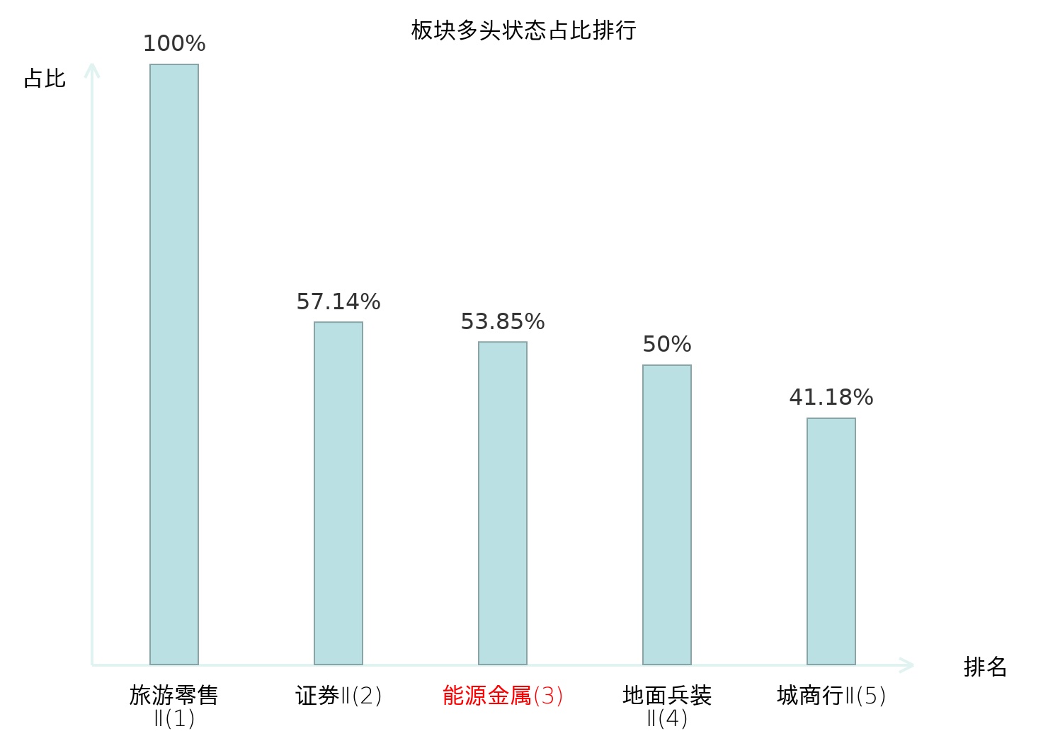 全市场所有行业板块中主力多头状态占比排名中,旅游零售Ⅱ板块位居第一。渔业板块名次提升最快,较昨日上升57位。