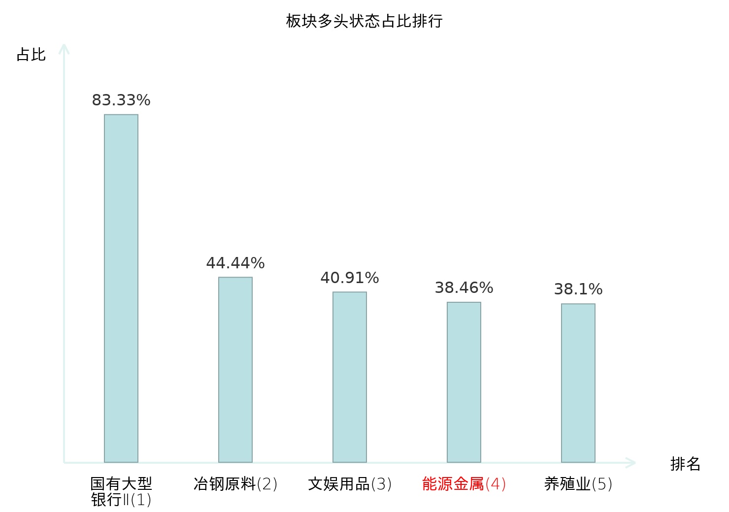 全市场所有行业板块中主力多头状态占比排名中,国有大型银行Ⅱ板块位居第一。影视院线板块名次提升最快,较昨日上升54位。