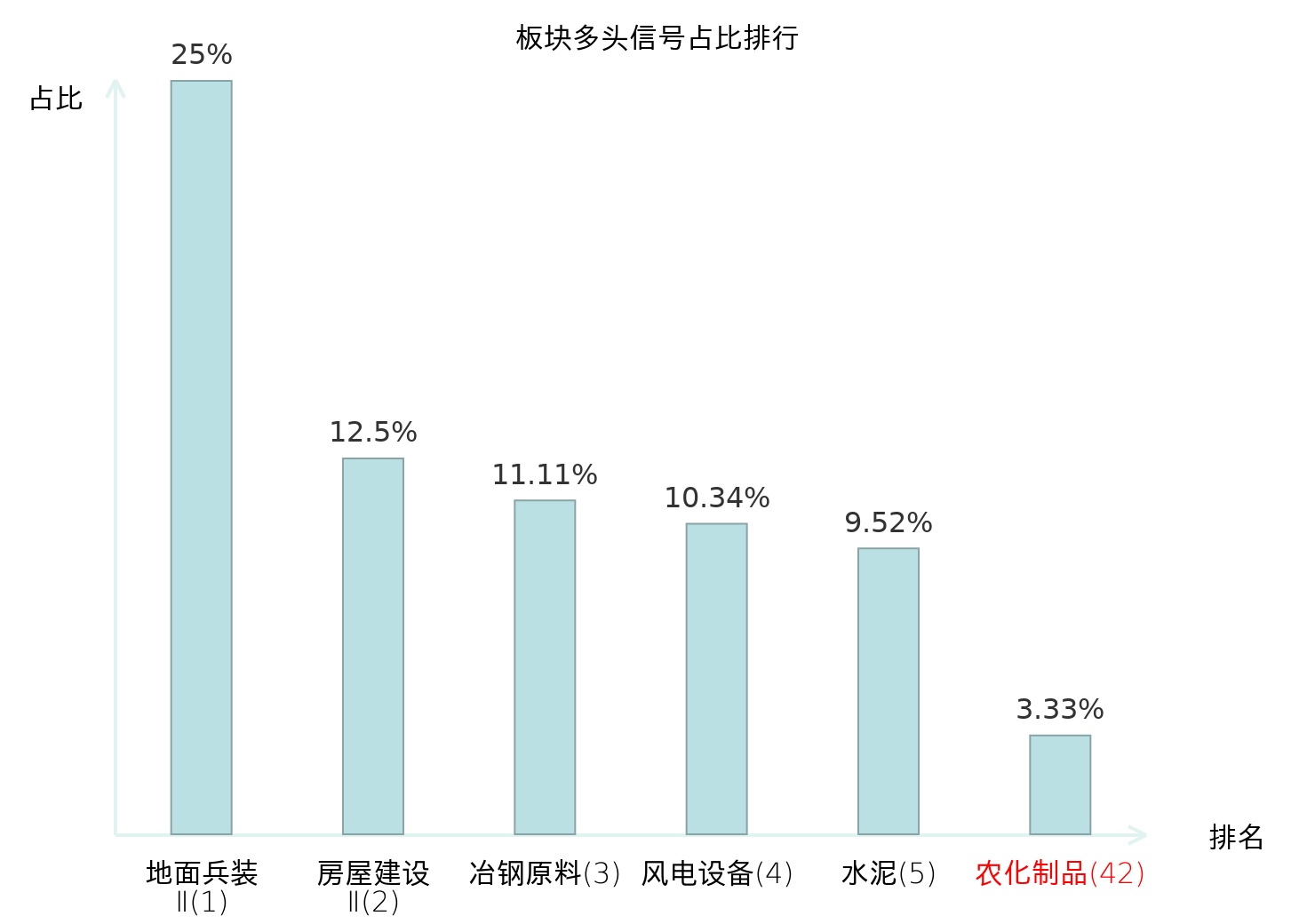 全市场所有行业板块中主力多头信号占比排名中,地面兵装Ⅱ板块位居第一。房屋建设Ⅱ板块名次提升最快,较昨日上升117位。