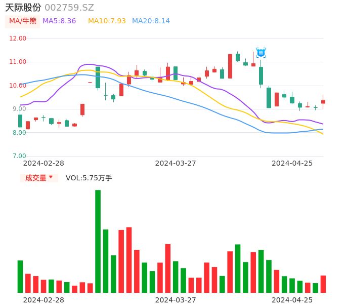 04月25日,天际股份收报9.37,股价涨幅3.42%,成交金额5391.88万元,换手率1.42%。
