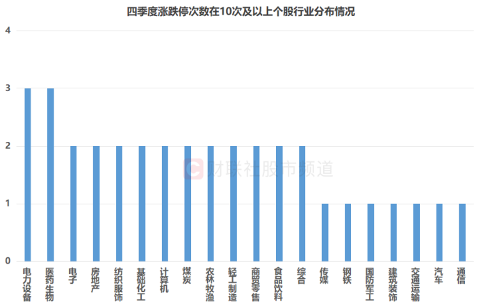 注:四季度涨跌停次数在10次及以上个股行业分布情况(截至12月19日收盘)