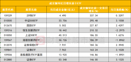 从成交额环比增长前十的ETF来看,沙特ETF(159329)成交额环比增长337%,位居首位;中证500ETF(510500)成交额环比增长295%,位居次席。