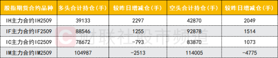 四大期指主力合约中,IH、IF合约多空双方均加仓,IM合约多空双方均减仓,IM合约空头减仓数量较多。