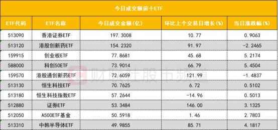 从成交额前十的ETF来看,香港证券ETF(513090)成交额位居首位,港股创新药ETF(513120)成交额位居次席。