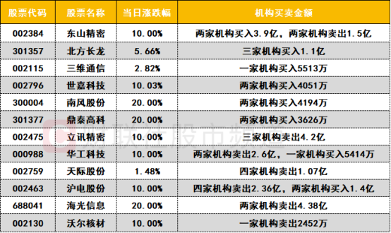卖出方面,电池概念股天际股份遭四家机构卖出1.07亿。立讯精密遭三家机构卖出4.2亿。海光信息遭两家机构卖出4.38亿。