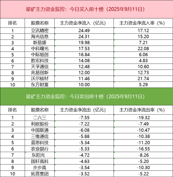 从个股主力资金监控数据来看,主力资金净流入前十的个股所属板块主要集中在算力硬件板块,立讯精密净流入居首。