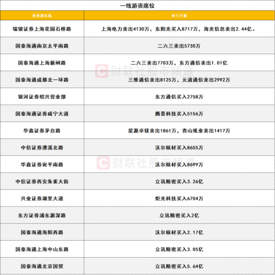 一线游资保持高活跃度,沃尔核材获三家一线游资席位合计买入超3.89亿;立讯精密获四家一线游资买入13.95亿;海光信息遭一家一线游资卖出2.44亿。