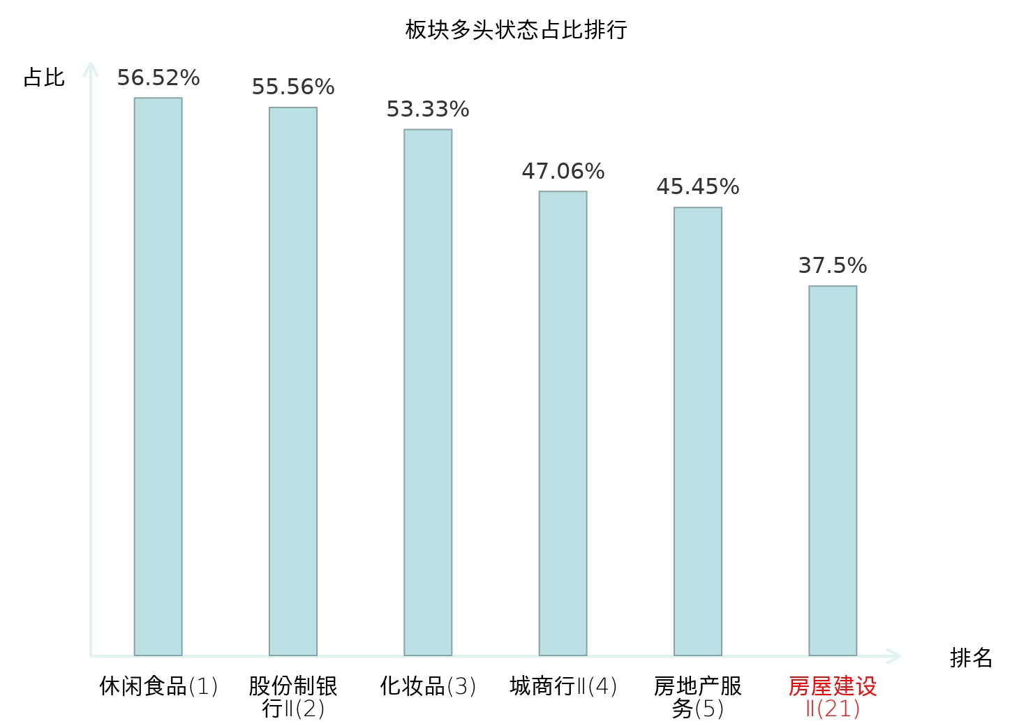 全市场所有行业板块中主力多头状态占比排名中,休闲食品板块位居第一。汽车服务板块名次提升最快,较昨日上升90位。