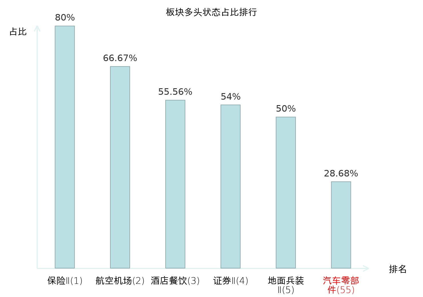 全市场所有行业板块中主力多头状态占比排名中,保险Ⅱ板块位居第一。特钢Ⅱ板块名次提升最快,较昨日上升69位。