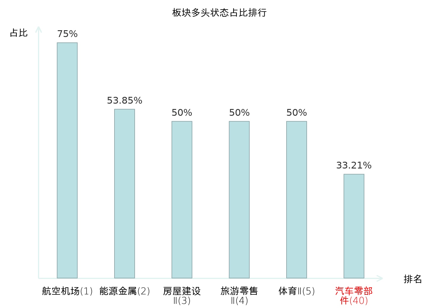 全市场所有行业板块中主力多头状态占比排名中,航空机场板块位居第一。其他电子Ⅱ板块名次提升最快,较昨日上升53位。