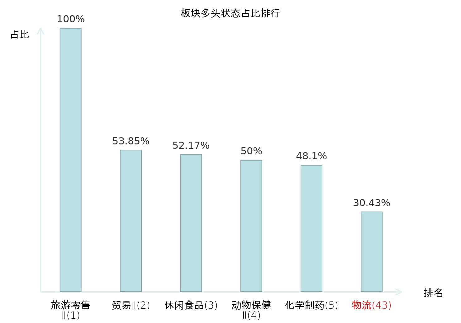 全市场所有行业板块中主力多头状态占比排名中,旅游零售Ⅱ板块位居第一。白酒Ⅱ板块名次提升最快,较昨日上升47位。