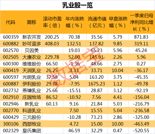 实际上,乳业股今年的股价表现走势比较分化,燕塘乳业、三元股份、庄园牧场、伊利股份的年内涨跌幅均为下跌。从今年一季度业绩看,新农开发、妙可蓝多的净利增速最大,分别上涨871.8%和319%,贝因美、大康农业和维维股份业绩实现增长,其他乳业股均出现业绩下滑,主要受疫情影响消费需求,新乳业、科迪乳业、三元股份、西部牧业、皇氏集团净利增速均下滑超200%,其中皇氏集团、西部牧业下滑幅度最大,分别为-521%、-463%。