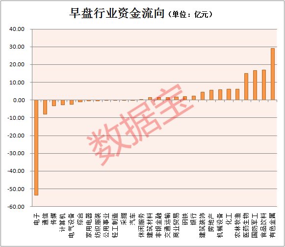 从板块资金流向看,电子行业资金净流出额最高,达54亿元,有色金属、食品饮料和国防军工板块均获净流入超15亿元。