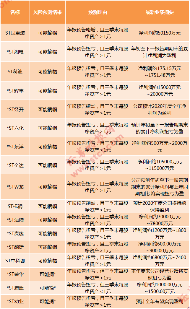 Wind关于ST股的风险预测结果显示,截至目前已披露2020年报业绩预告的ST股中,ST国重装、*ST湘电、ST科迪等17股有望摘星脱帽,其中,14股有望摘帽,3股有望摘星;10股则可能暂停上市。