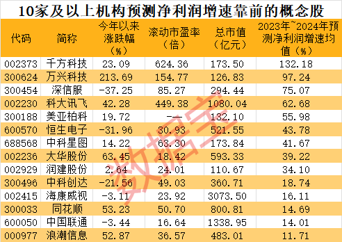 从机构关注度来看,有3只概念股今年以来机构调研超20次,其中中科创达以45次位居第一。从10家及以上机构一致预测来看,今明两年预测净利润增速均值超20%的概念股有9只,增速位于前列的有千方科技、万兴科技、深信服、科大讯飞和美亚柏科等。