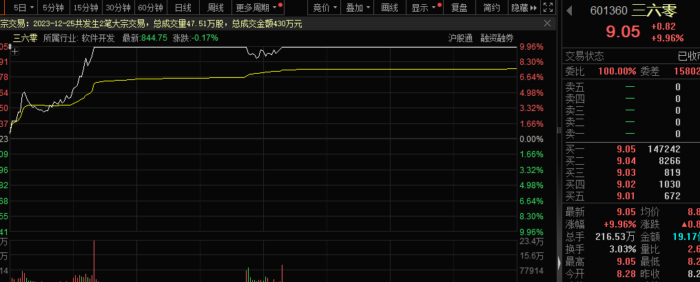 受消息影响,今日三六零涨停,收盘时封单仍近有15万手,最新市值近650亿元;真视通、云鼎科技涨幅居于前列。
