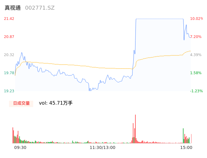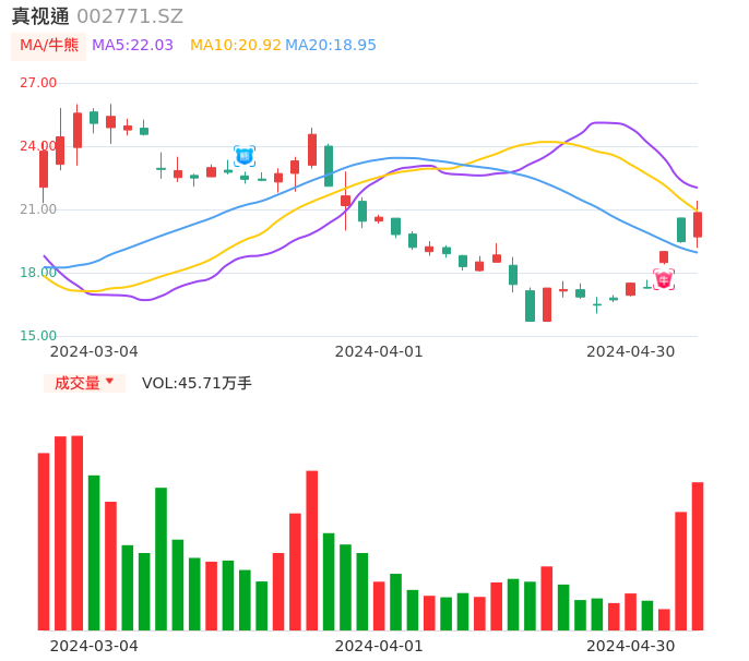 04月30日,真视通收报20.85,股价涨幅7.09%,成交金额9.35亿元,换手率26.76%。