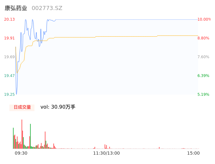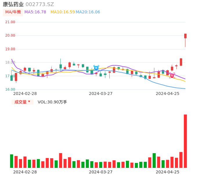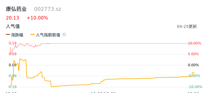 04月25日,康弘药业收报20.13,股价涨幅10.00%,成交金额6.16亿元,换手率4.51%。