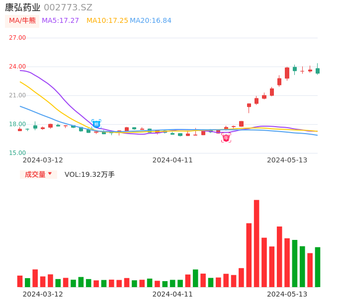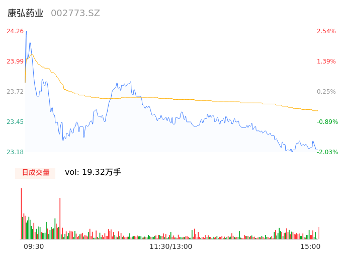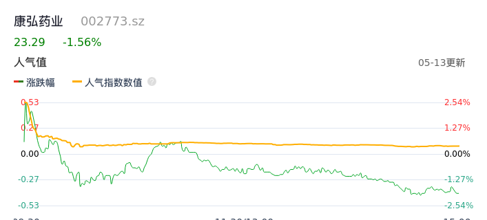 05月13日,康弘药业收报23.29,股价涨幅-1.56%,成交金额4.55亿元,换手率2.82%。