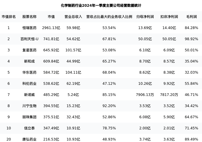 康弘药业最新报告期数据为一季度,下表汇总了化学制药行业内市值靠前的公司一季度主要经营数据