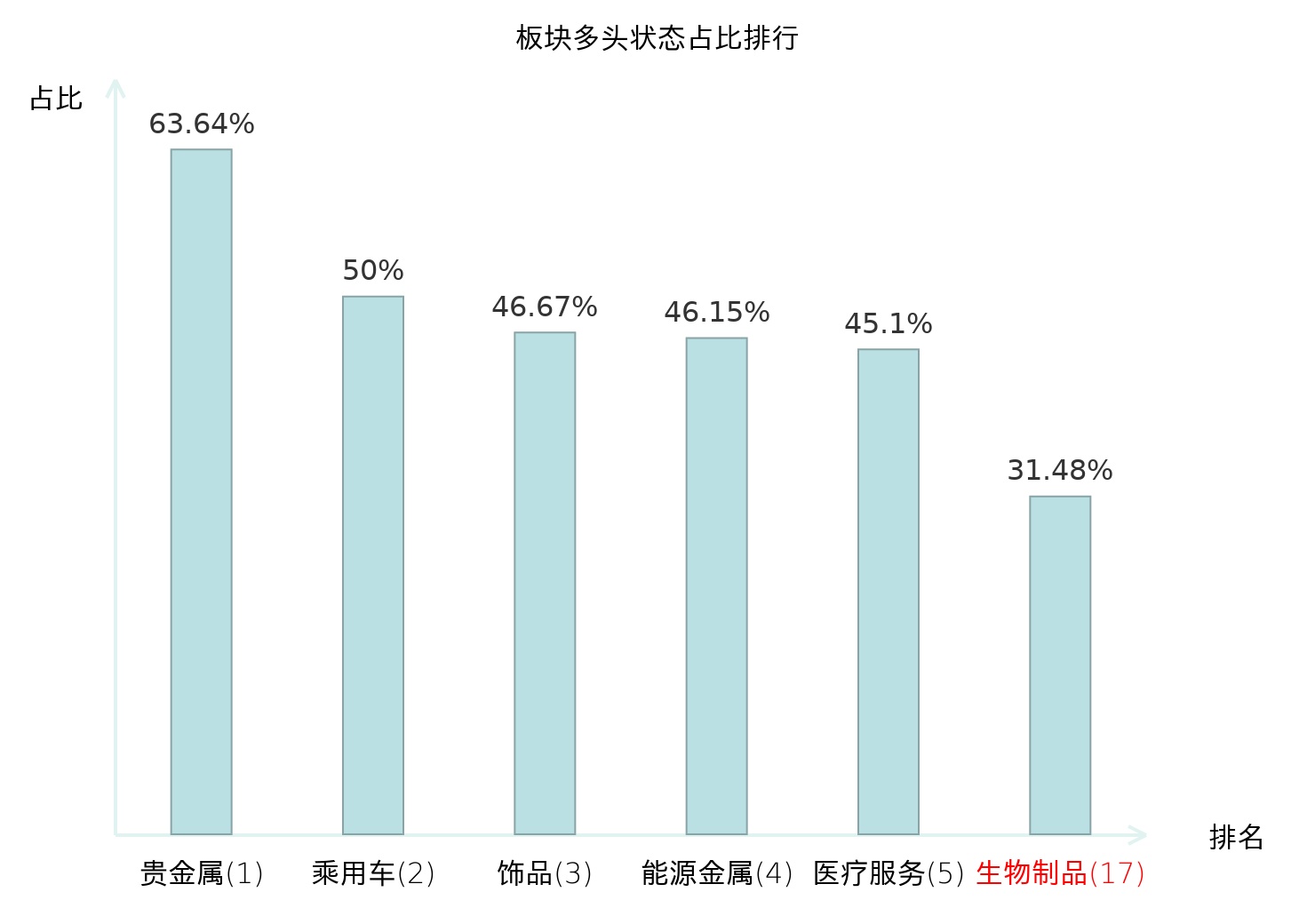 全市场所有行业板块中主力多头状态占比排名中,贵金属板块位居第一。电机Ⅱ板块名次提升最快,较昨日上升61位。