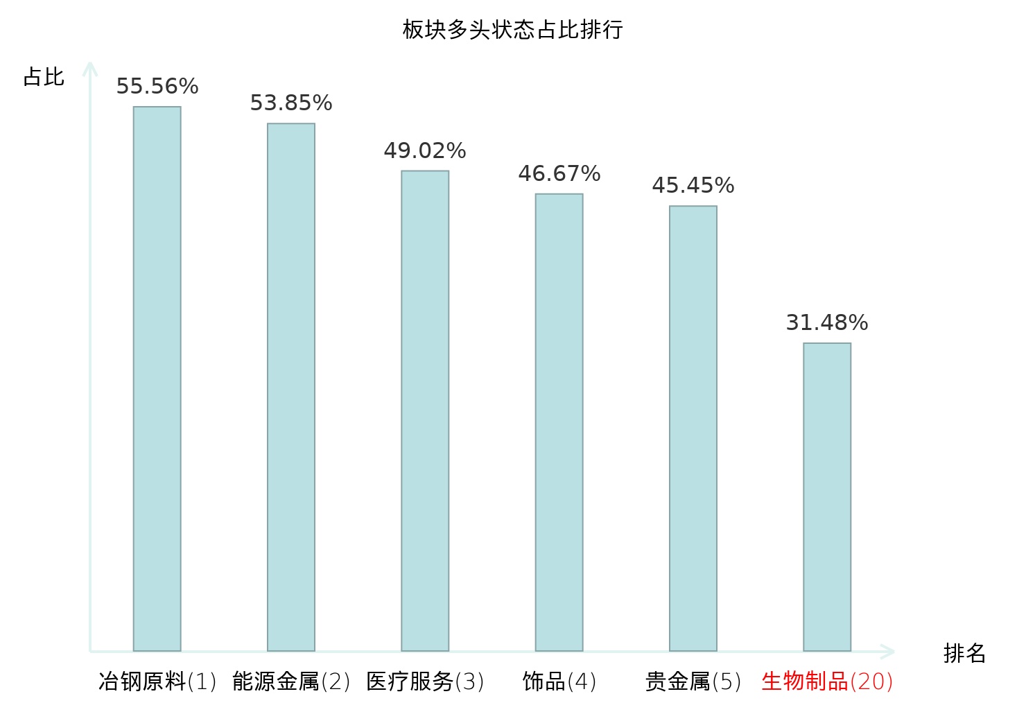 全市场所有行业板块中主力多头状态占比排名中,冶钢原料板块位居第一。能源金属板块名次提升最快,较昨日上升89位。