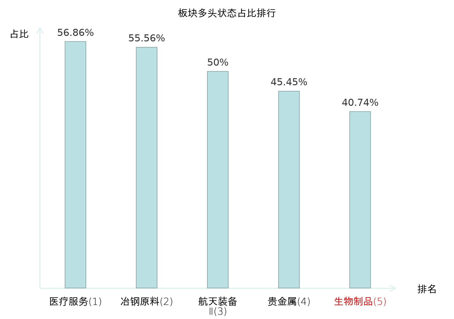 全市场所有行业板块中主力多头状态占比排名中,医疗服务板块位居第一。医疗美容板块名次提升最快,较昨日上升75位。