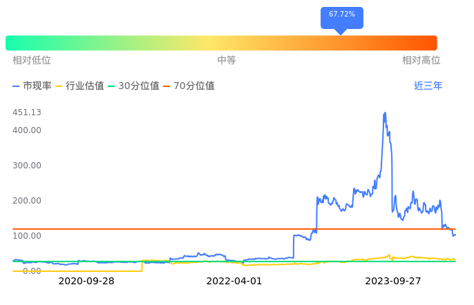 2023年09月28日,久远银海上涨1.71%收于26.72,今日成交金额2.62亿元。下文将从市盈率PETTM、市净率PB、市现率3个角度去分析公司估值情况。