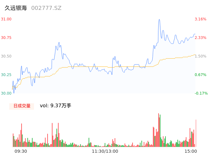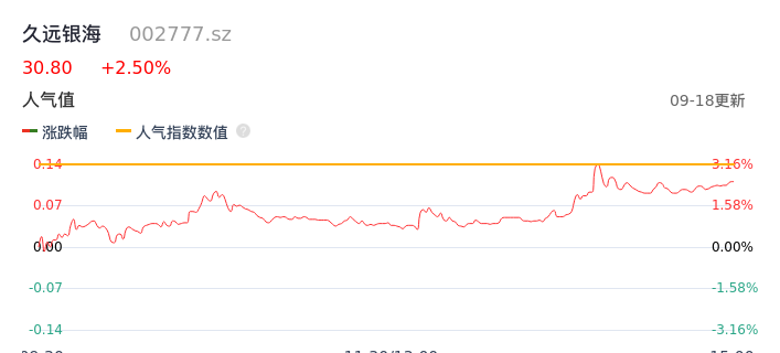 09月18日,久远银海收报30.80,股价涨幅2.50%,成交金额2.86亿元,换手率2.35%。